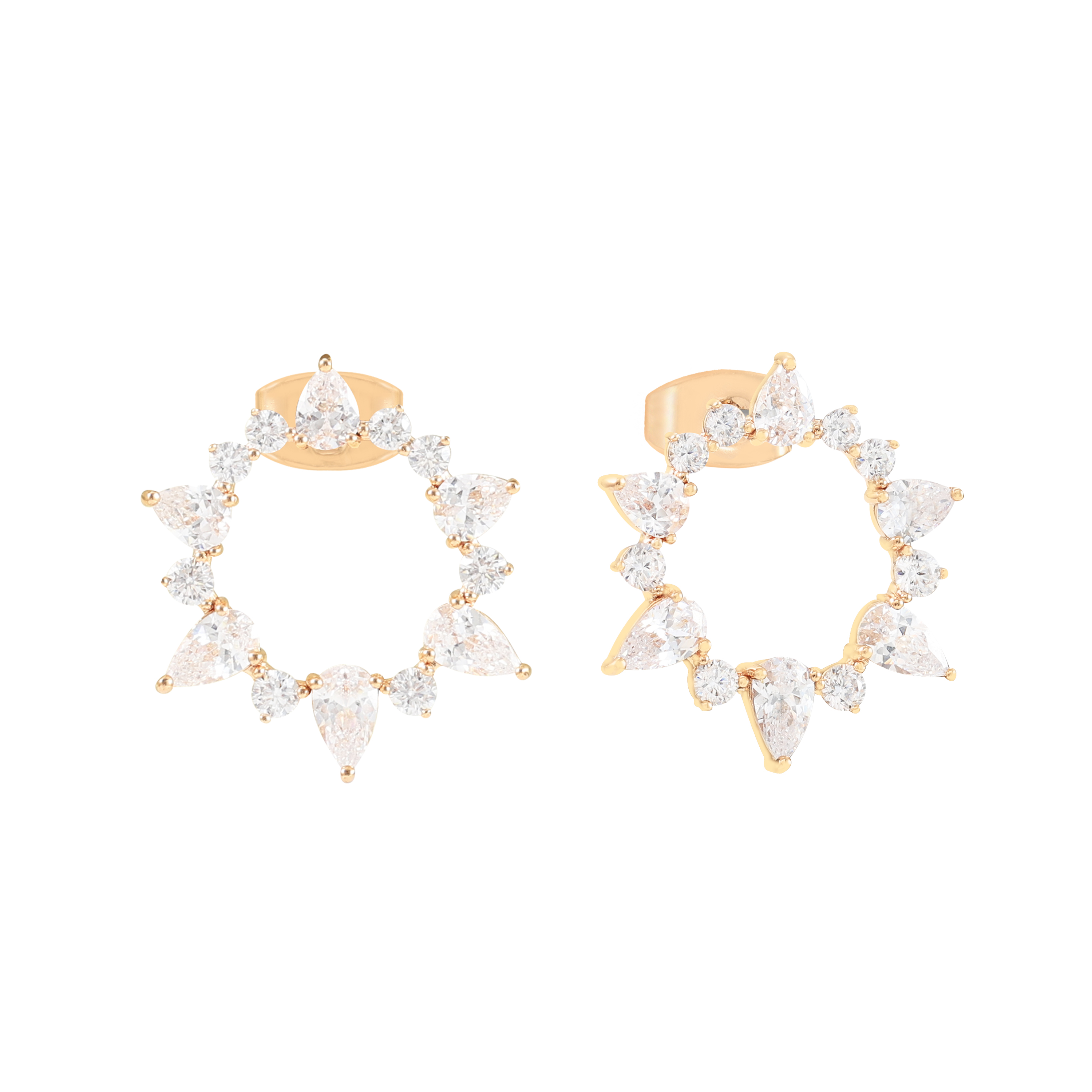 These striking earrings feature a radiant open circle design, adorned with alternating pear and round-cut clear crystals. Set in a polished gold finish, the arrangement creates a dazzling play of light, evoking both vintage glamour and modern refinement. Perfect for special occasions or to elevate everyday style, these earrings bring a touch of effortless sparkle and timeless sophistication. Designed with post backs, they offer both security and comfort.