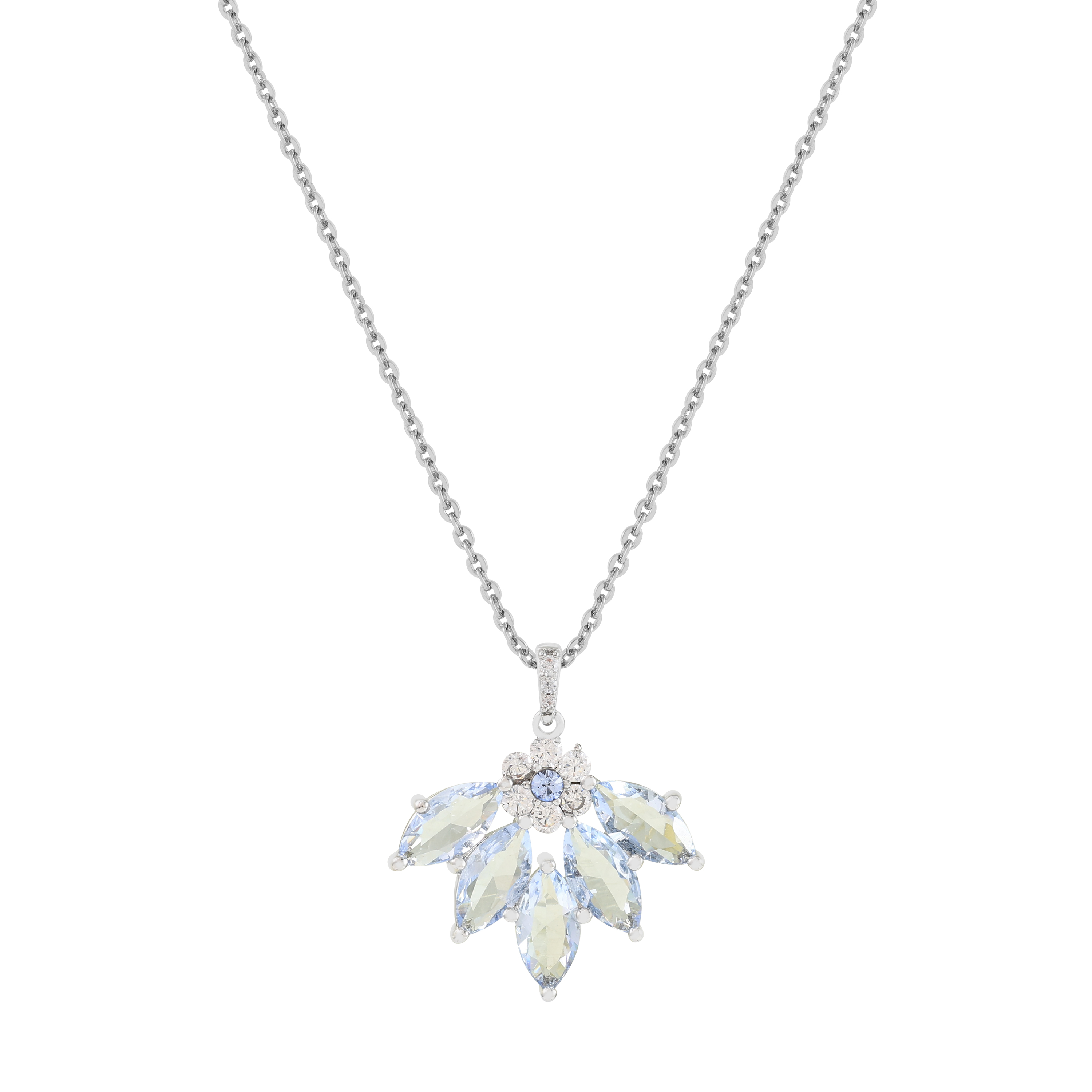 This vintage-inspired pendant showcases a radiant floral motif, crafted in silver and adorned with marquise-cut sapphire-toned crystals arranged like delicate petals. At the centre, a cluster of sparkling stones adds brilliance and depth, creating a piece that feels both romantic and refined. Suspended from an adjustable chain, this pendant is perfect for elevating everyday elegance or adding a graceful touch to evening attire.