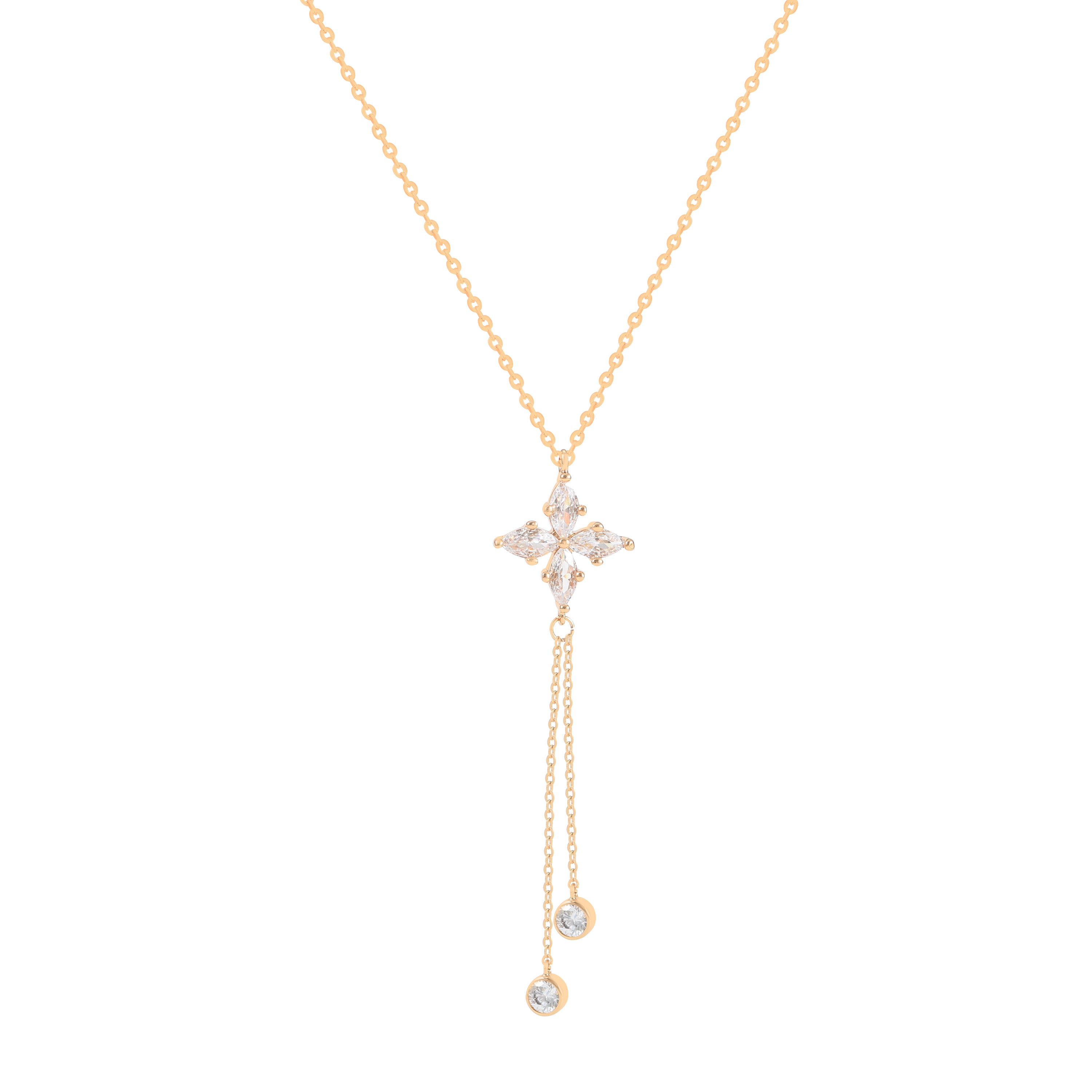This striking pendant features a vintage-inspired floral motif crafted from shimmering CZ stones, accented by two delicate chain drops that add movement and sparkle. Finished in radiant gold, the design captures both glamour and grace, making it an elegant statement piece for any occasion.