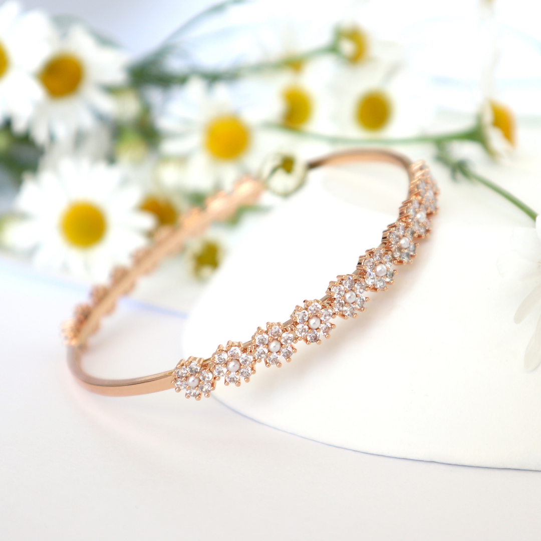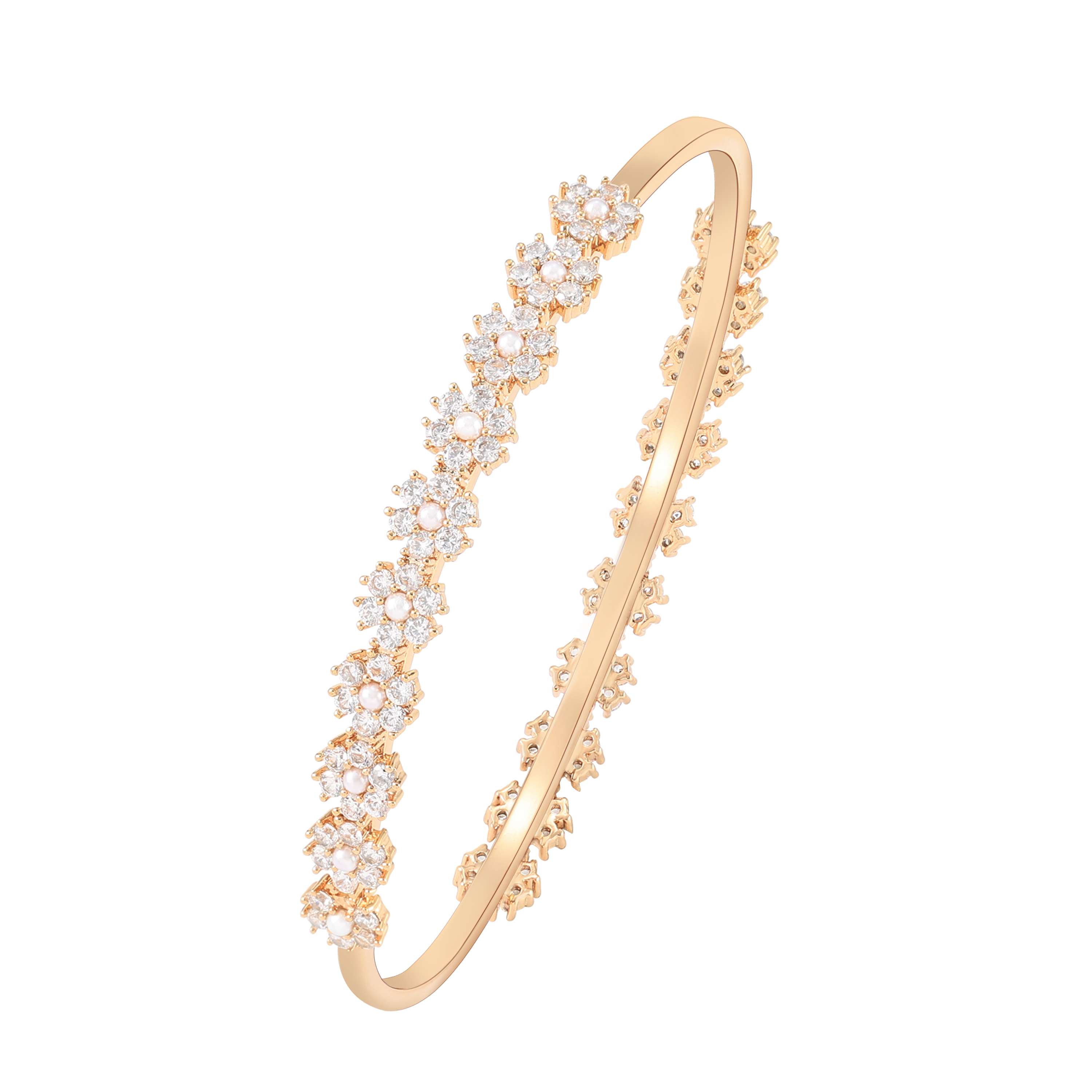 Crafted in polished gold, the bangle is adorned with a continuous line of daisy motifs, each petal sparkling with cubic zirconia stones. The slim, refined silhouette ensures it sits comfortably on the wrist, making it perfect for both everyday wear and special occasions. Effortlessly romantic, this bangle layers beautifully with other bracelets or shines on its own as a statement of elegance.