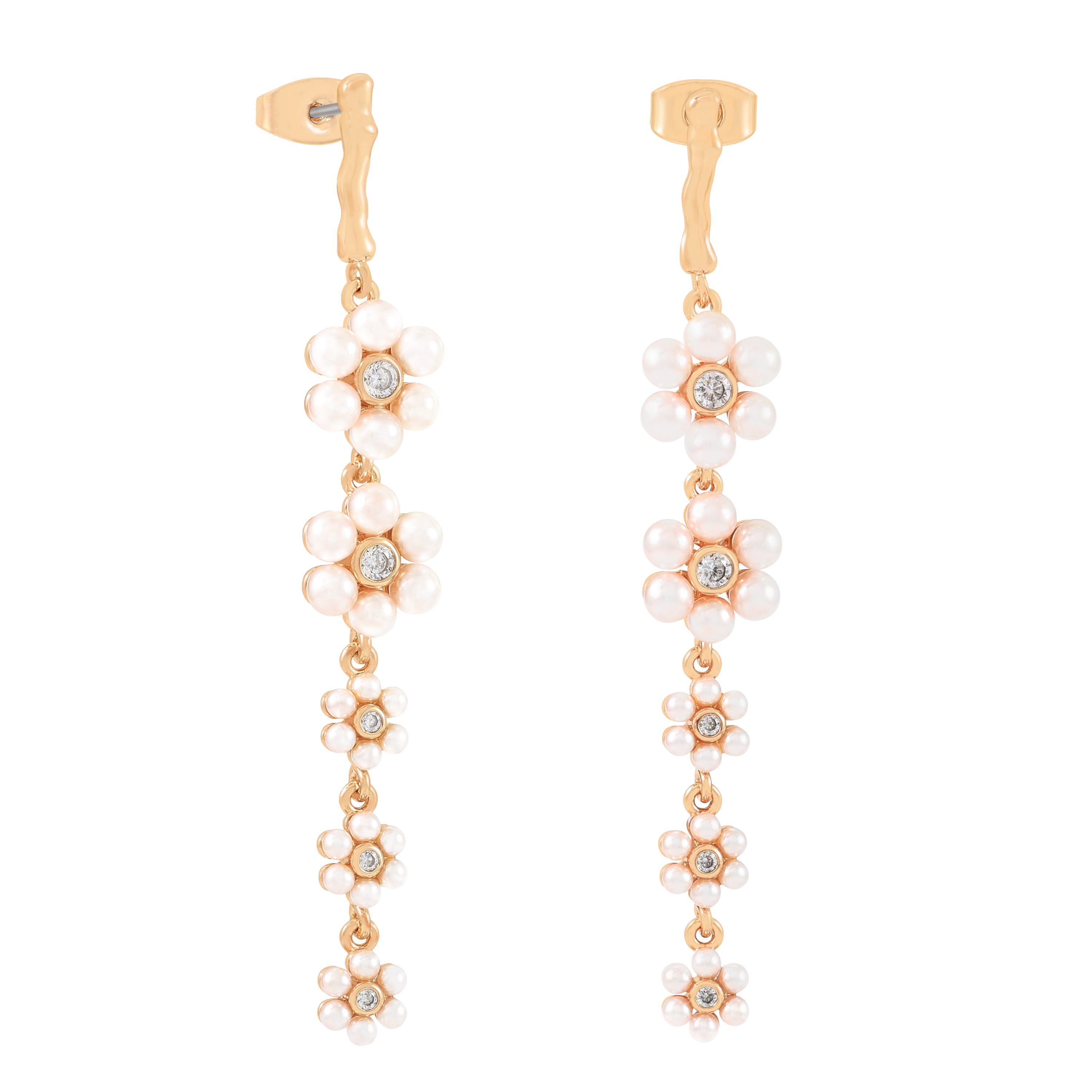 Crafted in polished gold, these earrings feature cascading daisy motifs, each petal formed with blush-pink pearls and centred with sparkling cubic zirconia. The long drop design sways beautifully with every movement, adding a touch of whimsy and glamour. Perfect for special occasions or elevating an evening outfit, they embody floral beauty with a modern twist.