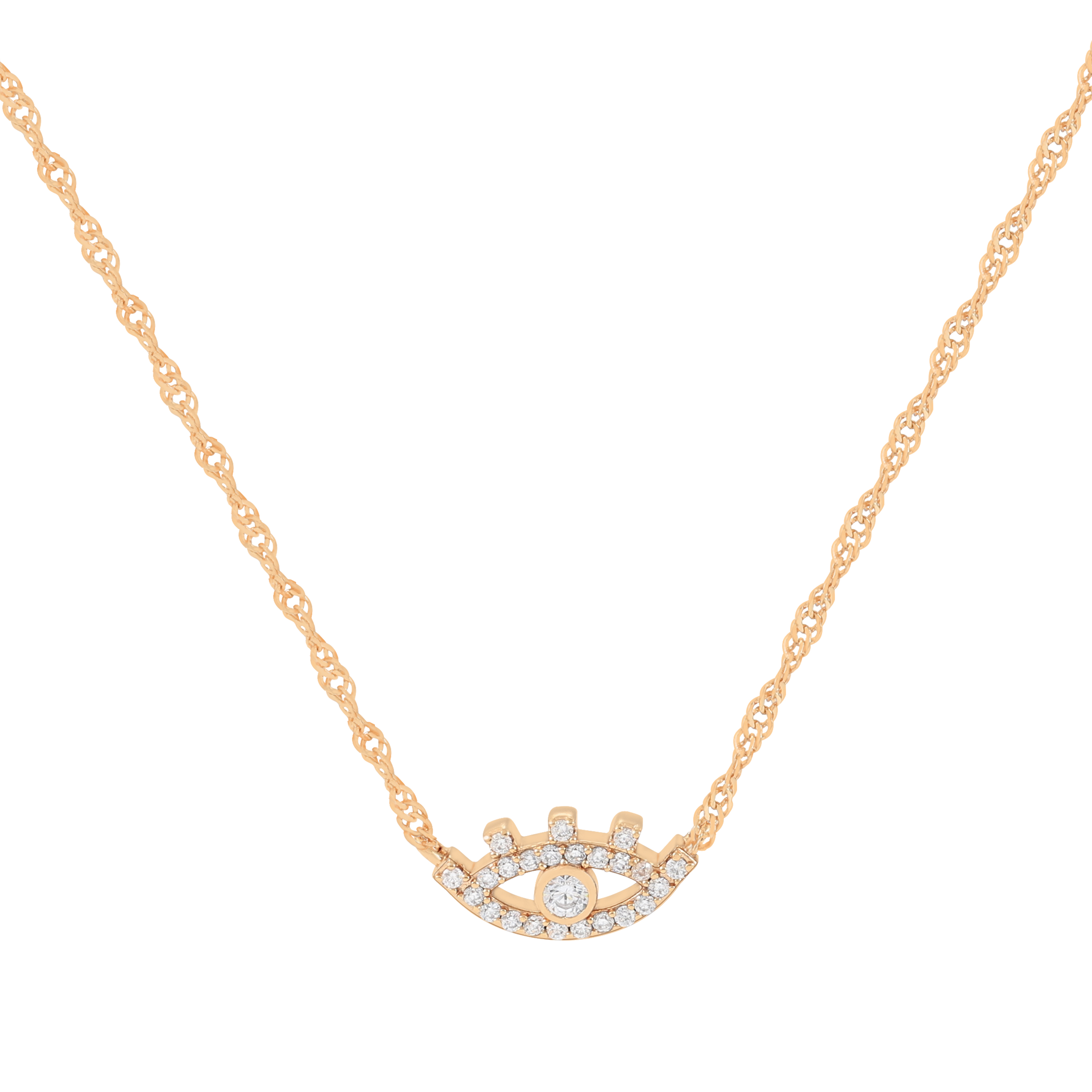 Crafted in polished gold, the necklace features a delicate Greek eye pendant set with sparkling pavé stones and a clear CZ at its centre, finished with subtle lash-like details for extra charm. Suspended on a fine adjustable chain, it’s the perfect necklace to wear solo for understated elegance or layered with other pieces for a contemporary look.