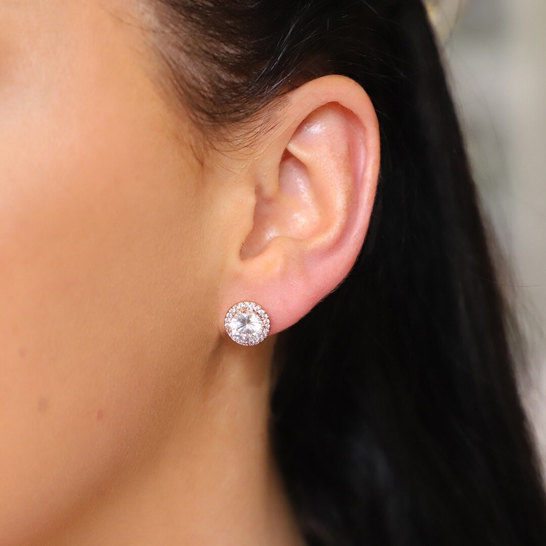 Perfect for day or evening wear, these elegant crystal post earrings will add sparkle with every turn of the head. Fashioned in romantic rose gold, each earring features a round cz stone, cut to sparkle and shimmer, wrapped in an embrace of tiny clear crystal accents. A radiant marriage of crystals and rose gold, brilliantly buffed these post earrings secure comfortably with push backs.